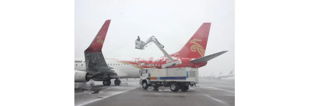 چین کے مشرقی صوبے جیانگ سو کےشہر چھانگ ژو میں پروازکے لیے تیارہوائی جہاز پربرف پگھلانے والے کیمیکل کا چھڑکاؤ کیا جارہا ہے۔(شِنہوا)