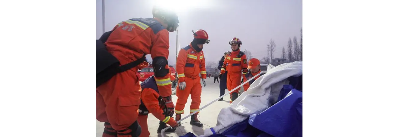 چین کے شمال مغربی صوبے گانسو کے لین شیا ہوئی خوداختیار پریفیکچر کی جی شی شان باؤآن، ڈونگ شیانگ ، سالارخوداختیارکاؤنٹی کے دیہات دا ہی میں امدادی کارکن خیمہ لگارہے ہیں۔ (شِنہوا)