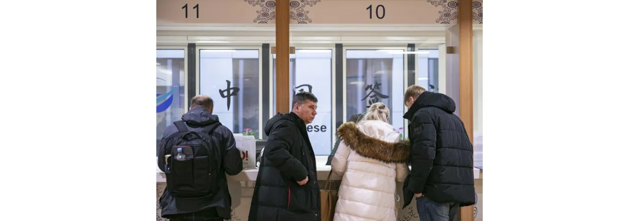 جرمنی، فرینکفرٹ میں ایک ویزا سنٹر پر  لوگ چینی ویزا کے لئے درخواست جمع کرارہے ہیں۔ (شِنہوا)