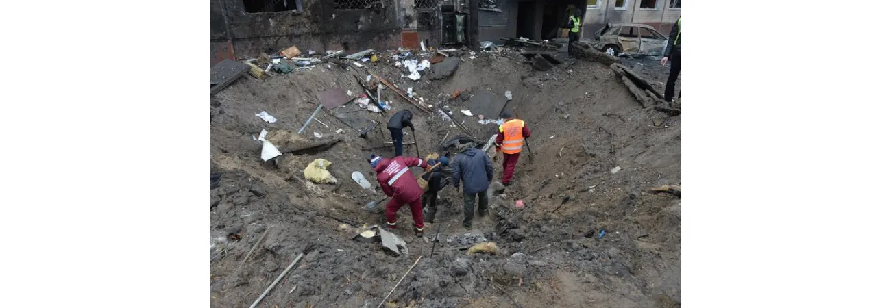 یوکرین ، کیف کے ضلع ڈینی پروسکی میں لوگ ایک گڑھے میں میزائل کے ٹکڑوں کی تلاش کر رہے ہیں۔ (شِنہوا)