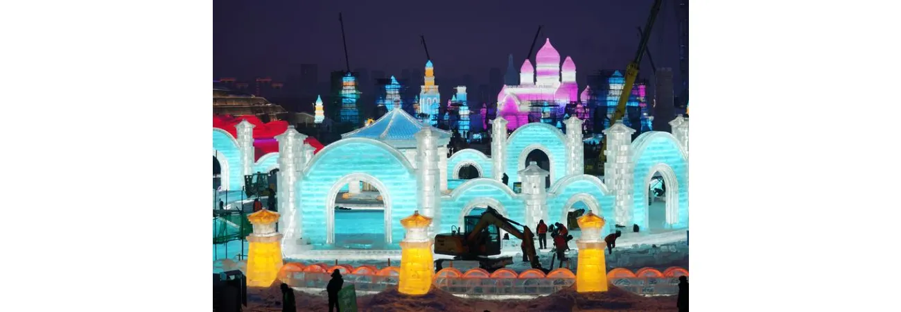 چین کے شمال مشرقی صوبے  حئی لونگ جیانگ کے شہر ہاربن میں موسم سرما میں کھلنے والے مشہور موسمی تھیم پارک میں مزدورہاربن آئس اینڈ سنو ورلڈ کے تعمیراتی مقام پر موجود ہیں۔(شِنہوا)