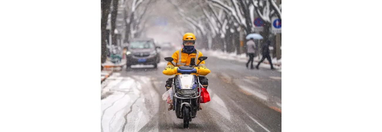 چین کے دارالحکومت بیجنگ میں ایک ڈیلیوری مین برف باری کے دوران  اپنی ڈیوٹی انجام دیتے ہوئے۔(شِنہوا)