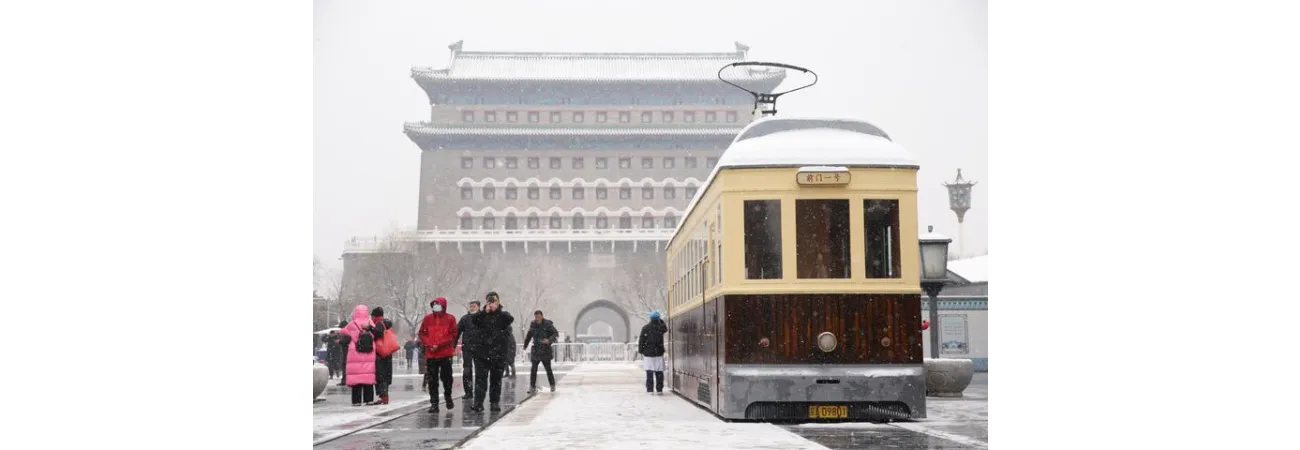 چین کے دارالحکومت بیجنگ کی چھیان مین اسٹریٹ پر سیاح برفباری سے لطف اندوز ہوتے ہوئے۔(شِنہوا)