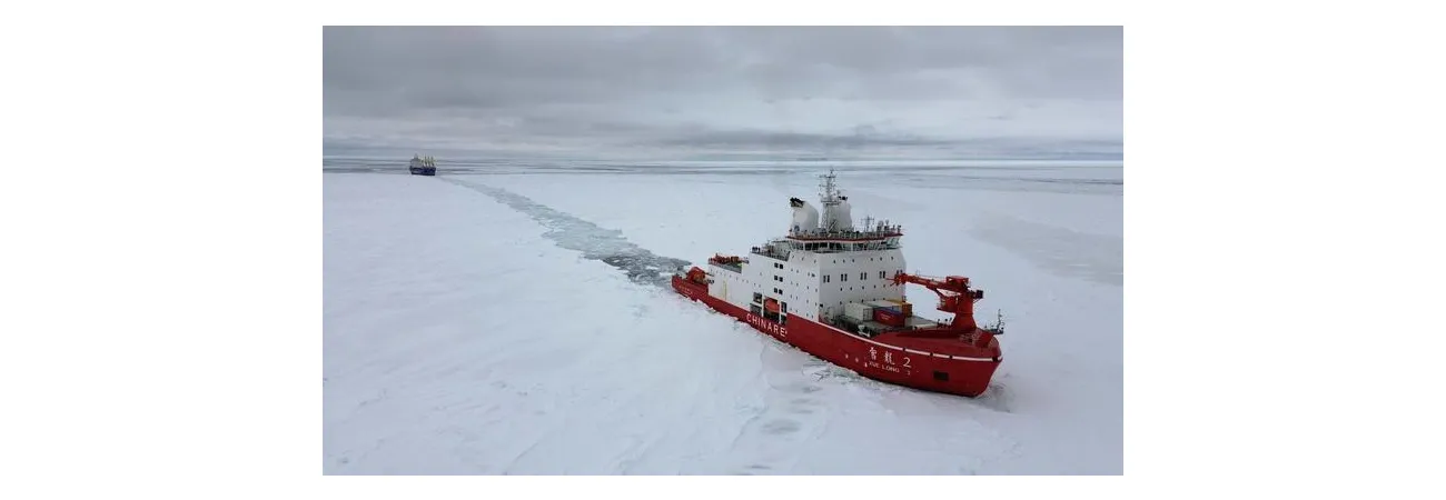 چین کا برف توڑنے والا جہاز شوئے لونگ 2 (قریب) برف توڑ کر مال بردار جہاز تیان ہوئی کے لیے آبی گزرگاہ بنارہا ہے۔ (شِںہوا)