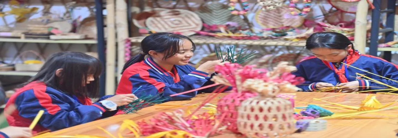 چین، جنوبی گوانگ شی ژوآنگ خوداختیارخطے کے شہر کان شی کے نان دو پرائمری اسکول میں طالبات بانس سے اشیاء تیار کرنے کی مشق کر رہی ہیں۔ (شِنہوا)