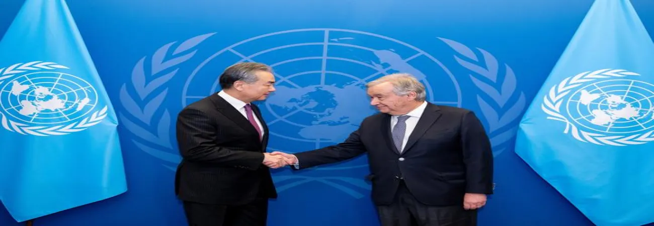 چینی وزیر خارجہ وانگ یی  نیویارک میں اقوام متحدہ کے ہیڈ کوارٹر میں اقوام متحدہ کے سیکرٹری جنرل انتونیو گوتریس سے ملاقات کرتے ہوئے۔(شِنہوا)