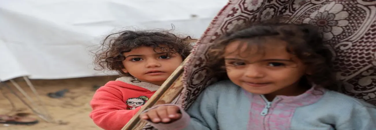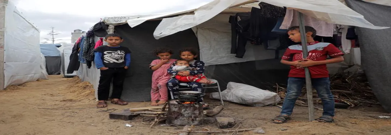 غزہ کی پٹی کے جنوبی شہر خان یونس میں ایک عارضی پناہ گزین کیمپ میں فلسطینی بچے پناہ لیے ہوئے ہیں۔(شِنہوا)
