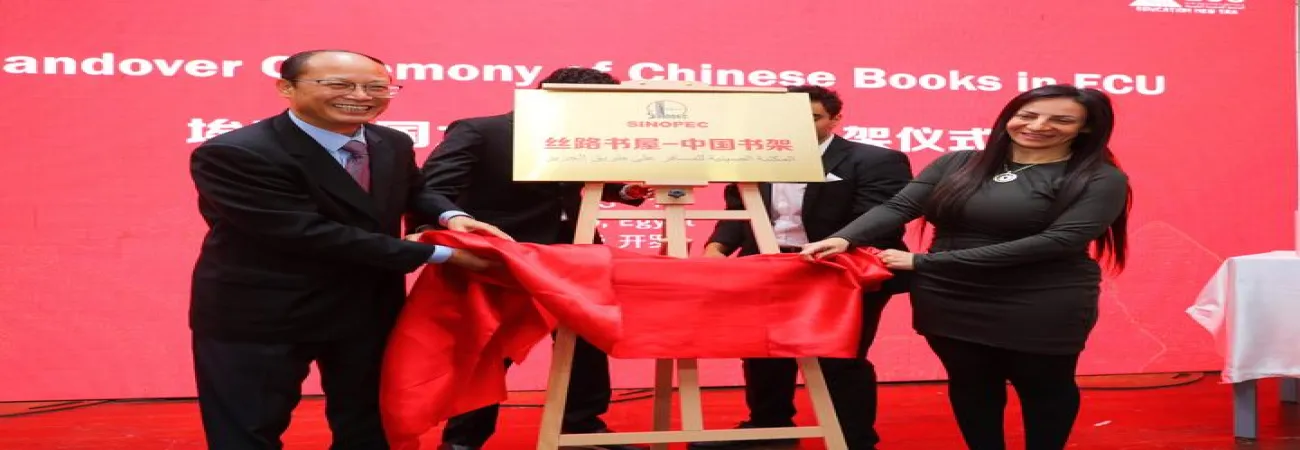 مصر میں چینی سفارتخانے کے منسٹر قونصلر لو چھون شینگ (بائیں ) مصری چینی یونیورسٹی (ای سی یو) کے وائس چیئرمین سوناتا محمد ابراہیم کے ساتھ کتابوں کے عطیہ بورڈ کی نقاب کشائی کررہے ہیں۔(شِنہوا)
