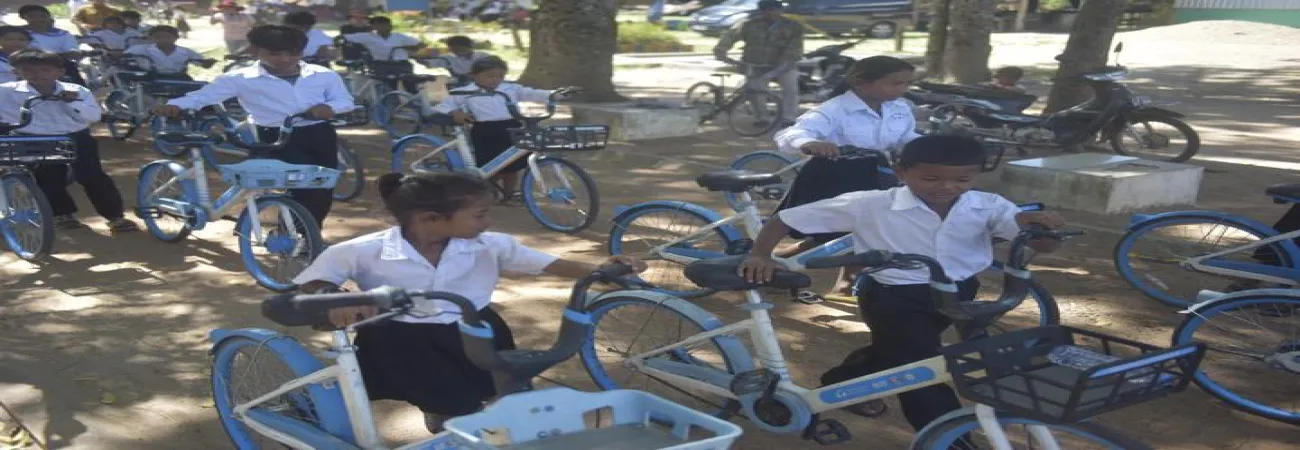 کمبوڈیا کے صوبے کمپونگ چھنانگ کے ایک  پرائمری اسکول کے طلباء  چین کی جانب سے  عطیہ کردہ اپنی سائیکلز کے ساتھ دیکھے جاسکتے ہیں۔(شِنہوا)