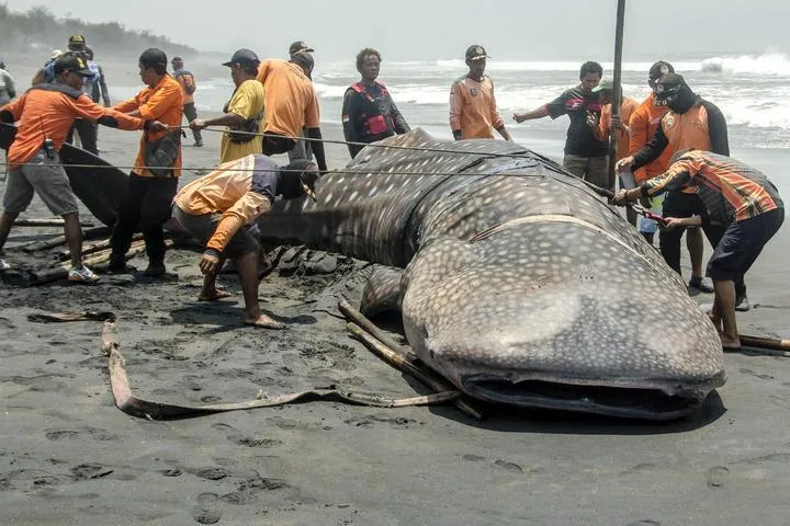 انڈونیشیا کے یوگیکارتا کے ساحل پر ریسکیو اہلکارپھنسی ہوئی وہیل شارک کوپانی میں منتقل کرنے کی کوشش کر رہے ہیں۔(شِنہوا)
