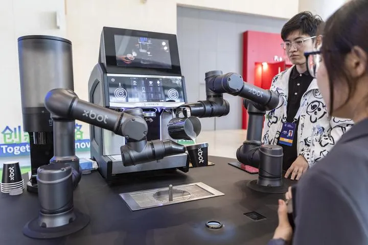چین، جنوب مغربی بلدیہ چھونگ چھنگ میں سائنس اور ٹیکنالوجی تبادلے پر پہلی بیلٹ اینڈ روڈ کانفرنس کے دوران شرکا روبوٹ کے تیار کردہ کافی کے منتظر ہیں۔ (شِںہوا)