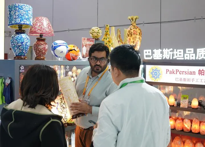 چین، مشرقی شنگھائی میں منعقدہ چھٹی چائنہ بین الاقوامی درآمدی نمائش میں ایک پاکستانی نمائش کنندہ گاہکوں کو ایک لیمپ بارے بتارہا ہے۔ (شِںہوا)