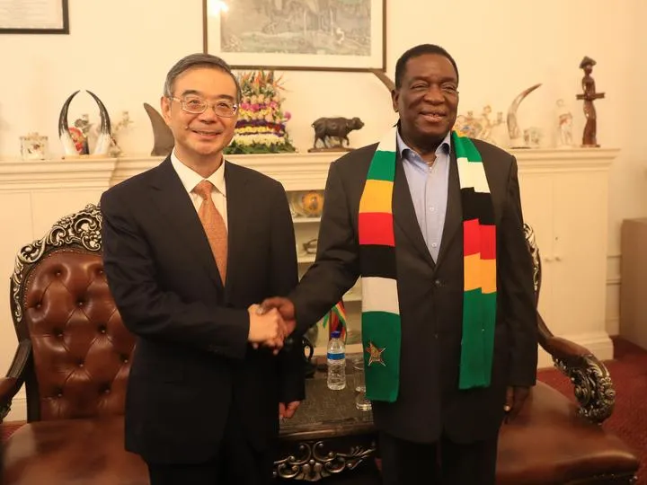 زمبابوے کے نومنتخب صدر ایمرسن منانگاگوا ہرارے میں سٹیٹ ہاؤس میں چینی صدر شی جن پھنگ کے خصوصی ایلچی اور چینی عوامی سیاسی مشاورتی کانفرنس کی قومی کمیٹی کے نائب چیئرمین ژو چھیانگ سے ملاقات کے دوران مصافحہ کر رہے ہیں۔(شِنہوا)