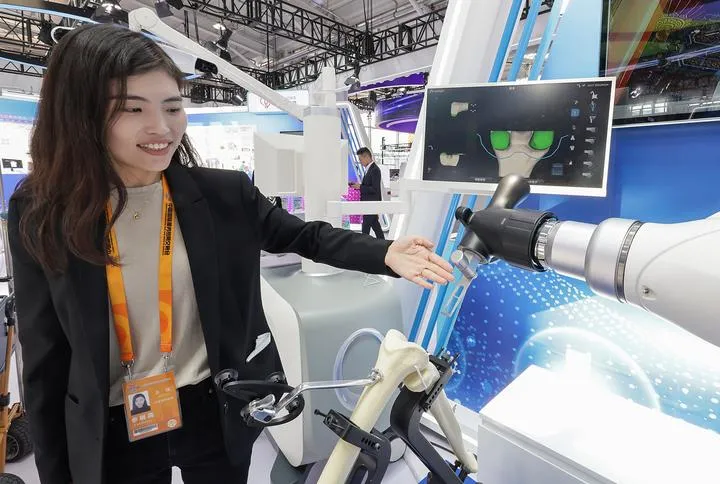 چین، دارالحکومت بیجنگ کے شو گانگ پارک میں منعقدہ 2023 چائنہ بین الاقوامی میلہ برائے تجارتی خدمات کے دوران صحت عامہ خدمات کے بو تھ میں عملے کی ایک رکن گھٹنے کی سرجری کرنے والا روبوٹ متعارف کرارہی ہے۔(شِںہوا)