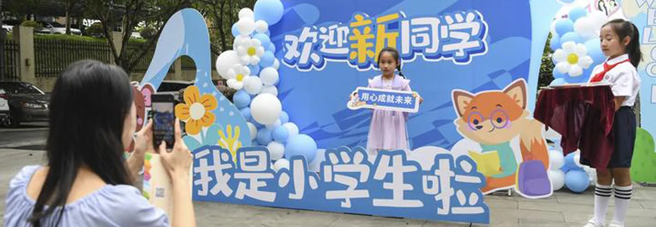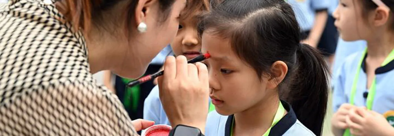 چین، مشرقی صوبہ انہوئی کے شہر ہیفے میں واقع تن شی روڈ پرائمری اسکول میں ایک استانی نئی داخلہ لینے والی طالبات کے ماتھے پر نقش و نگار بنا رہی ہے۔ ۔ (شِنہوا)