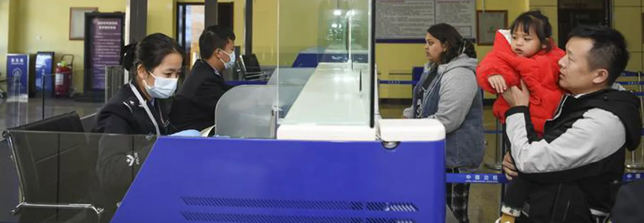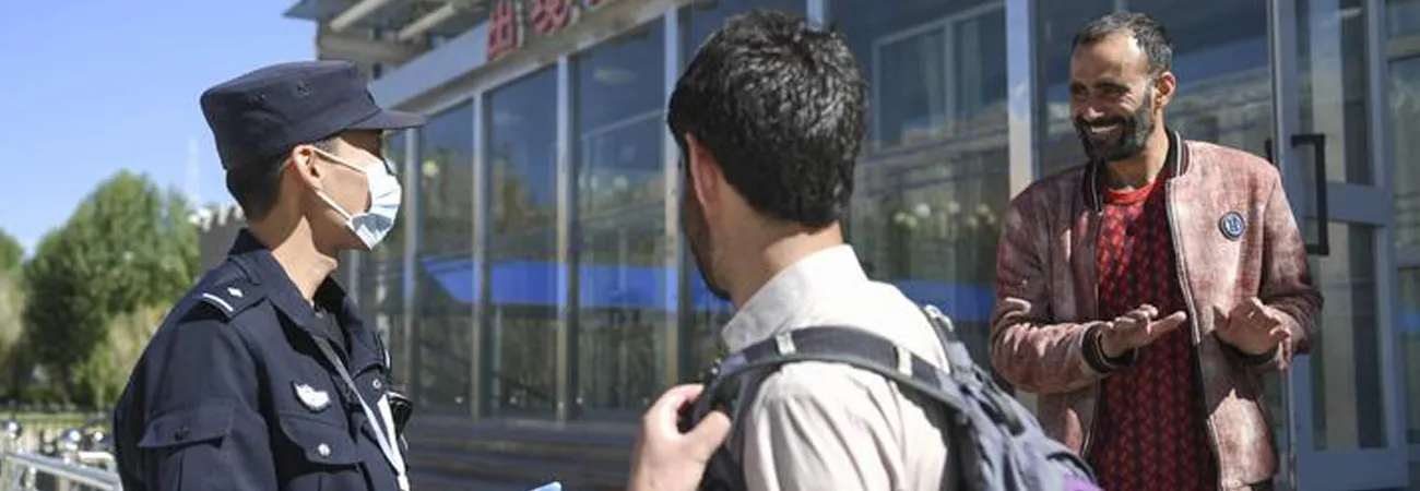 چین ، شمال مغربی سنکیانگ ویغور خود اختیار خطے کی ٹیکس کورگان تاجک خود اختیار کاؤنٹی میں پولیس اہلکار پاکستان سے آنے والے مسافر سے بات چیت کررہا ہے۔(شِنہوا)