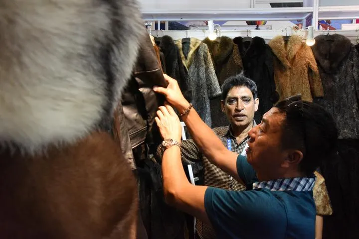 چین - جنوبی ایشیا نمائش میں پاکستانی تاجرایک خریدار کو چمڑے کے کوٹ دیکھا رہا ہے۔(شِنہوا)