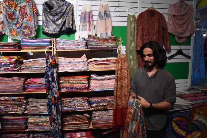 چین - جنوبی ایشیا نمائش میں ایک پاکستانی تاجرکپڑے کی ملبوسات  دکھاتے ہوئے۔(شِنہوا)