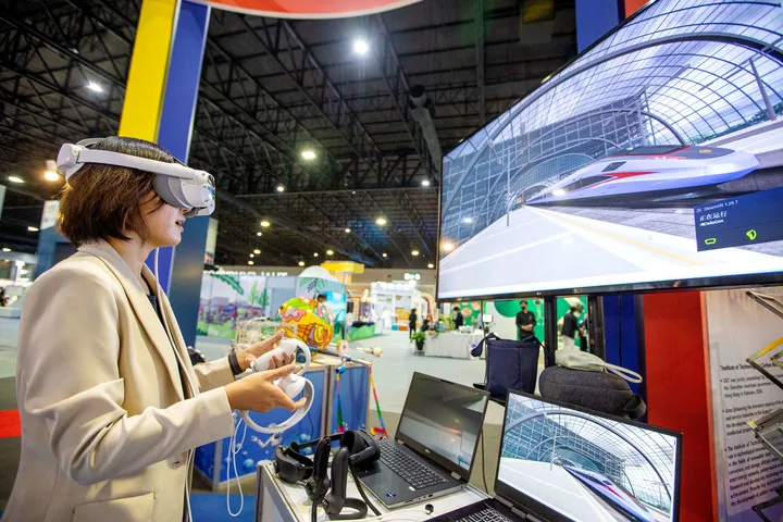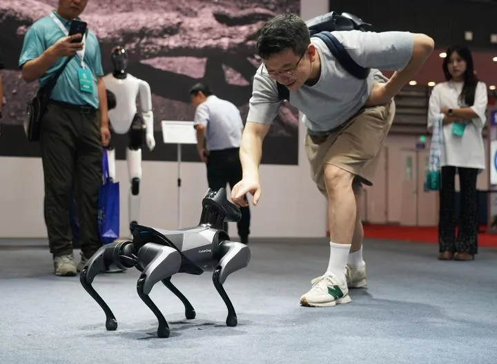 چین کے دارالحکومت بیجنگ میں ورلڈ روبوٹ کانفرنس 2023 میں ایک روبوٹ کتے کے ساتھ ایک شخص بات کر رہا ہے۔(شِںہوا)