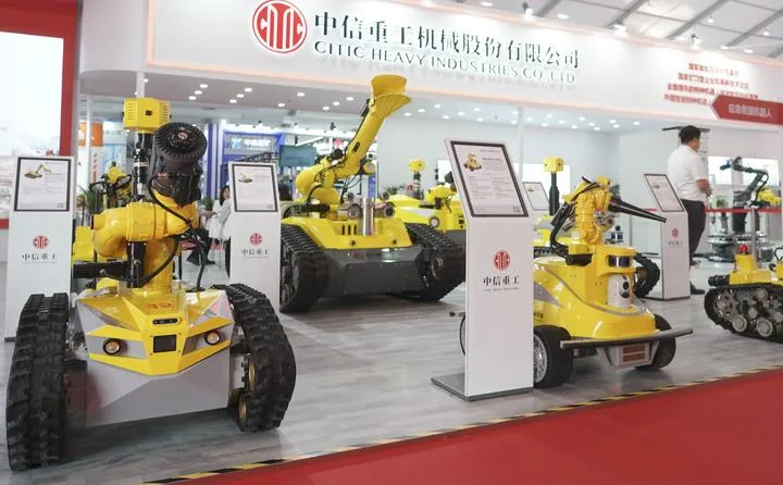 چین کے دارالحکومت بیجنگ میں ورلڈ روبوٹ کانفرنس 2023 میں آگ بجھانے والے روبوٹس نمائش کے لیے رکھے گئے ہیں۔(شِںہوا)