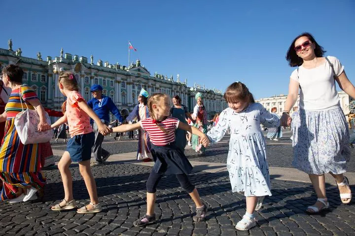 روس کے سینٹ پیٹرزبرگ میں پیلس اسکوائر پر لوگ ساتویں "روسی سرکل ڈانس" بین الاقوامی میلے کے دوران دائرے کی صورت میں رقص کر رہے ہیں۔(شِنہوا)