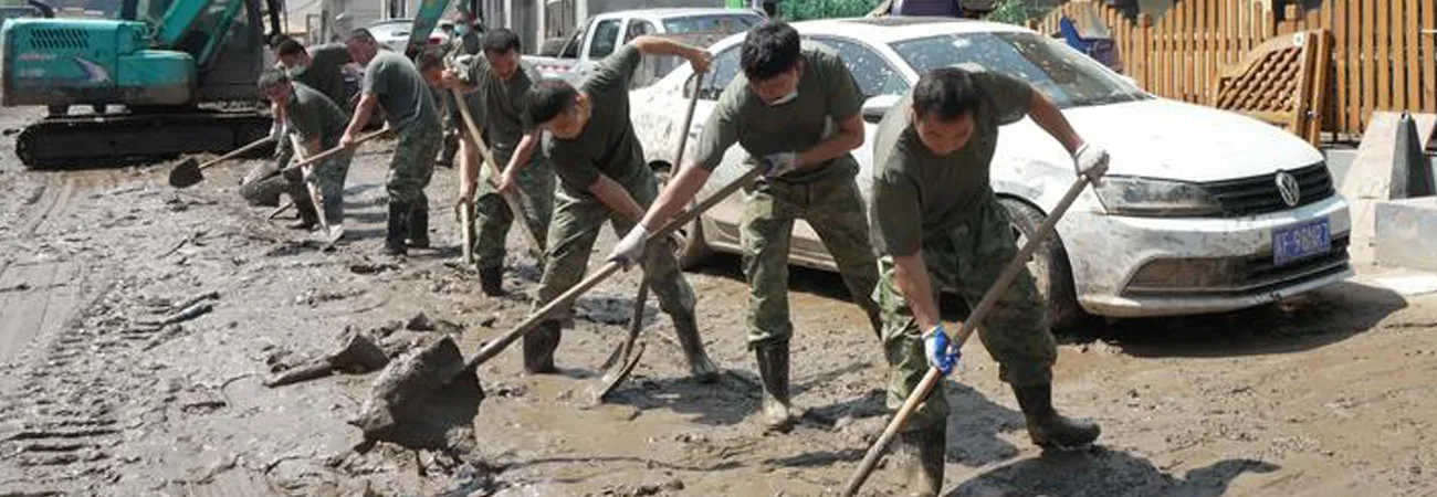چین، شمالی صوبہ ہیبے کی کاؤنٹی لائی شوئی کے قصبے سان پو کے دیہات لیو جیا ہی میں رضاکار کیچڑ صاف کررہے ہیں۔ (شِنہوا)