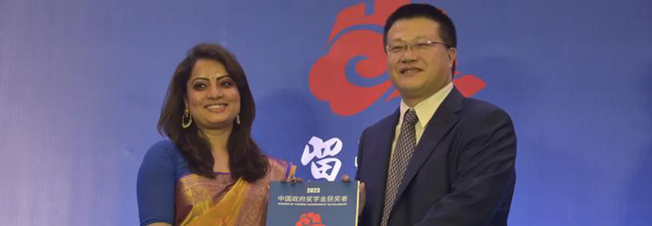 بنگلہ دیش، ڈھاکہ میں ایک  الوداعی استقبالیہ میں بنگلہ دیش میں چینی سفیر یاؤ وین وظیفہ حاصل کرنے والی ایک خاتون کو پیشکشی خط دے رہے ہیں۔(شِنہوا)