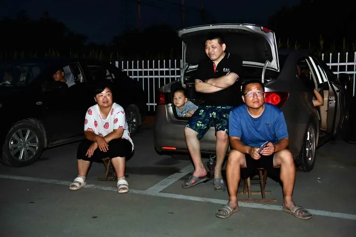 چین، مشرقی صوبہ شان ڈونگ کی کاؤنٹی پھنگ یوآن کے قصبے وانگ ڈا گوا میں زلزلے کے بعد لوگ کھلے آسمان تلے بیٹھے ہیں۔ (شِنہوا)