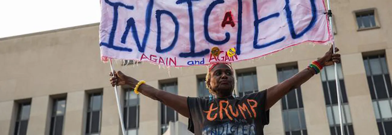 امریکی دارالحکومت واشنگٹن ڈی سی میں ای بیریٹ پریٹی مین کورٹ ہاؤس کےسامنے ایک خاتون ڈونلڈ ٹرمپ پرعائد فرد جرم کے بارے میں ایک بینر پکڑے کھڑی ہے جہاں ٹرمپ کوجمعرات کوپیش کیا جائے گا۔(شِنہوا)