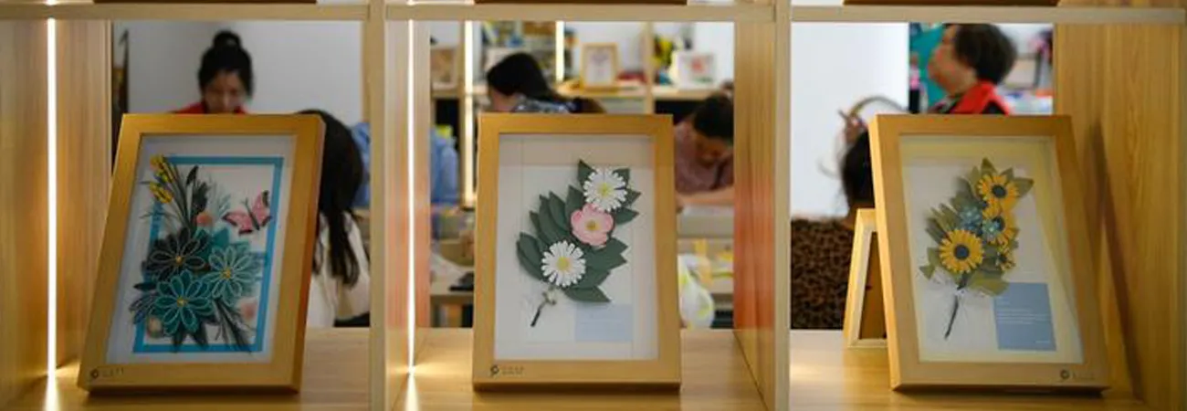چین کے جنوب مغربی صوبہ سیچھوان کے شہر چھنگ ڈو کے ضلع وین جیانگ میں ایک ثقافتی اورتخلیقی ورکشاپ میں کاغذپرکوئلنگ کےفن پارے رکھے گئےہیں۔(شِنہوا)