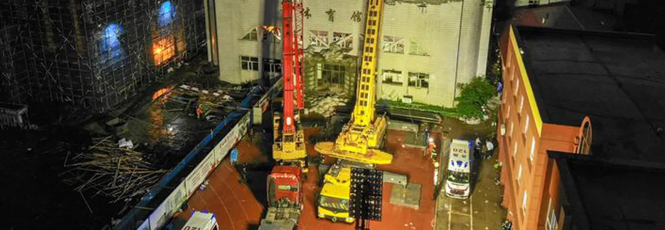 چین کے شمال مشرقی صوبہ حئی لونگ جیانگ کے چھی چھی ہار میں مڈل سکول کے منہدم ہونے والے جمنازیم کے مقام کا منظرجہاں چھت گرنے سے گیارہ افراد ہلاک ہو گئے۔(شِنہوا)