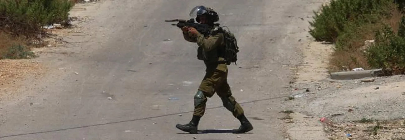 نابلس کے قریب مغربی کنارے کے گاؤں کفرقدوم میں یہودی بستیوں کی توسیع کے خلاف مظاہرے کے بعد جھڑپوں کے دوران ایک اسرائیلی فوجی اپنے ہتھیارسےفلسطینی مظاہرین کو نشانے پرلے رہا ہے۔(شِنہوا)