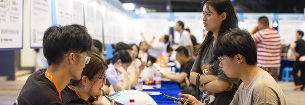 چین، مشرقی صوبہ ژے جیانگ کے شہر جن ہوا میں کالج گریجویٹس کے لئے منعقدہ ملازمت میلے کے دوران ملازمت کے متلاشی نوجوان اسامیوں بارے معلومات حاصل کررہے ہیں۔(شِنہوا)