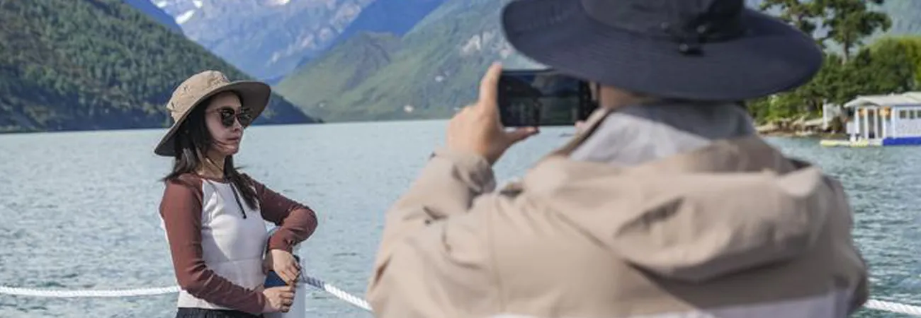 چین، جنوب مغربی تبت خوداختیار خطے کے شہر نی ینگ چی کی کاؤنٹی گونگبو گیامڈا کے دیہات  میں ایک خاتون سیاح کا تصاویر کے لئے انداز ۔ (شِنہوا)