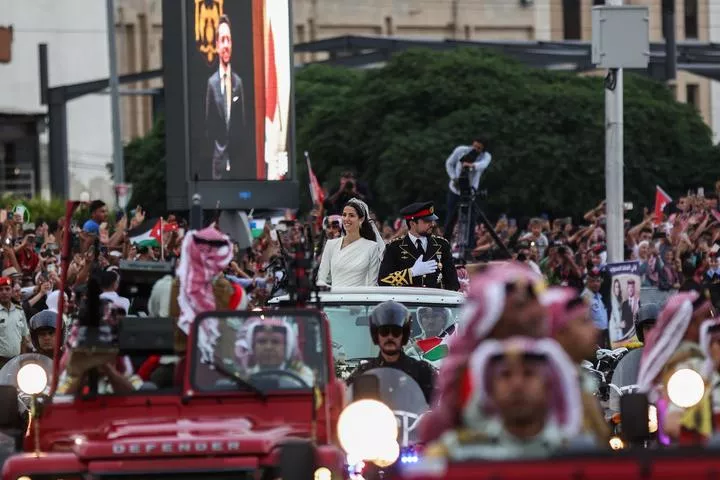 اردن کے ولی عہد حسین اور سعودی عرب کی  راجوا السیف اردن کے شہر عمان میں اپنی شادی کی تقریب کے بعد موٹر کیڈ جلوس کے دوران لوگوں کا خیر مقدم کر رہے ہیں۔(شِنہوا)