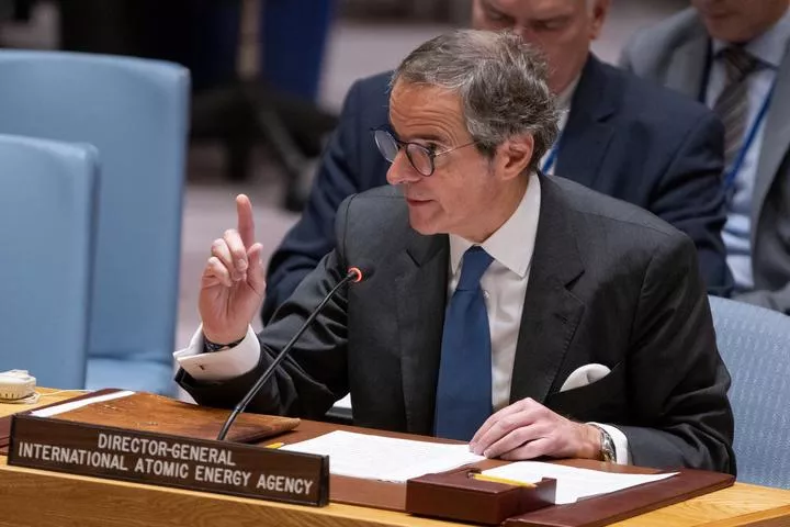 انٹرنیشنل اٹامک انرجی ایجنسی (آئی اے ای اے) کے ڈائریکٹر جنرل رافیل گروسی نیویارک میں اقوام متحدہ کے ہیڈکوارٹر میں سلامتی کونسل کے اجلاس کو یوکرین کے زاپوریشیا جوہری توانائی پلانٹ پر بریفنگ دے رہے ہیں  جسے انہوں نےخطرناک قرار دیا۔(شِنہوا)