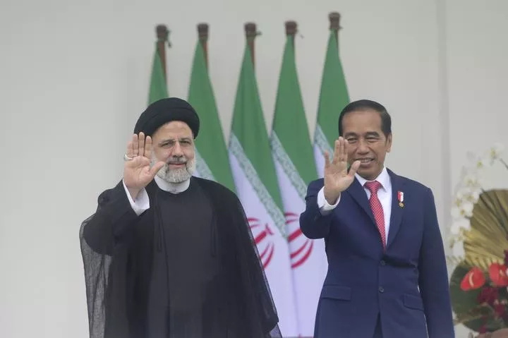 انڈونیشیا کے صدرجوکوویدودو(دائیں) اورایرانی صدر ابراہیم رئیسی انڈونیشیا کے شہر بوگور میں صدارتی محل میں صحافیوں کی طرف ہاتھ لہرا رہے ہیں۔(شِنہوا)