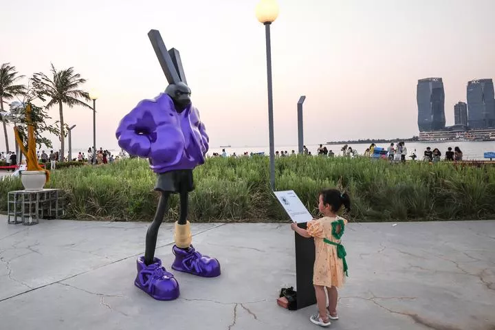 چین ، جنوبی صوبہ ہائی نان کے شہر ہائیکو کے ہائیکو بے میں 2023 ہائیکو شہری مجسمہ سازی فنون میلہ  کے دوران ایک بچہ ورم ہول لائبریری کے باہر ایک مجسمہ دیکھ رہا ہے۔ (شِنہوا)