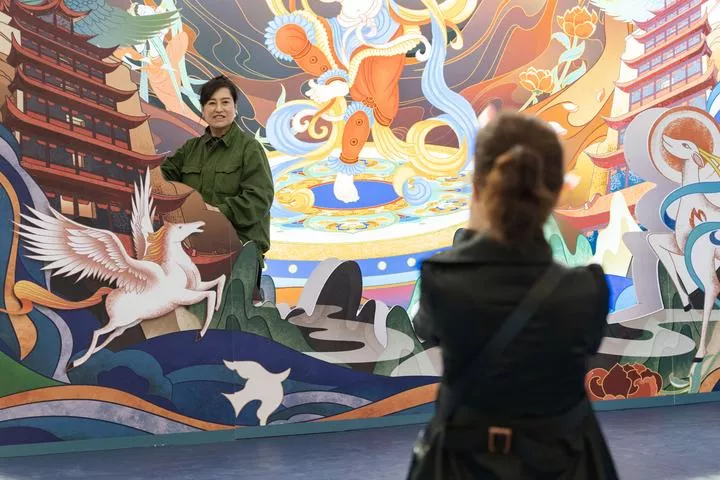 چین ، شمال مشرقی صوبہ حئی لونگ جیانگ کے شہر ہاربن میں منعقدہ شمال مشرقی ایشیا فنون و ڈیزائن نمائش میں ایک سیاح کا تصویر کے لئے انداز۔ (شِنہوا)