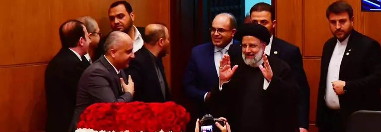ایرانی صدر ابراہیم رئیسی شام کے شہر دمشق میں تاجروں کے اجتماع کی طرف ہاتھ لہرا رہے ہیں۔(شِنہوا)