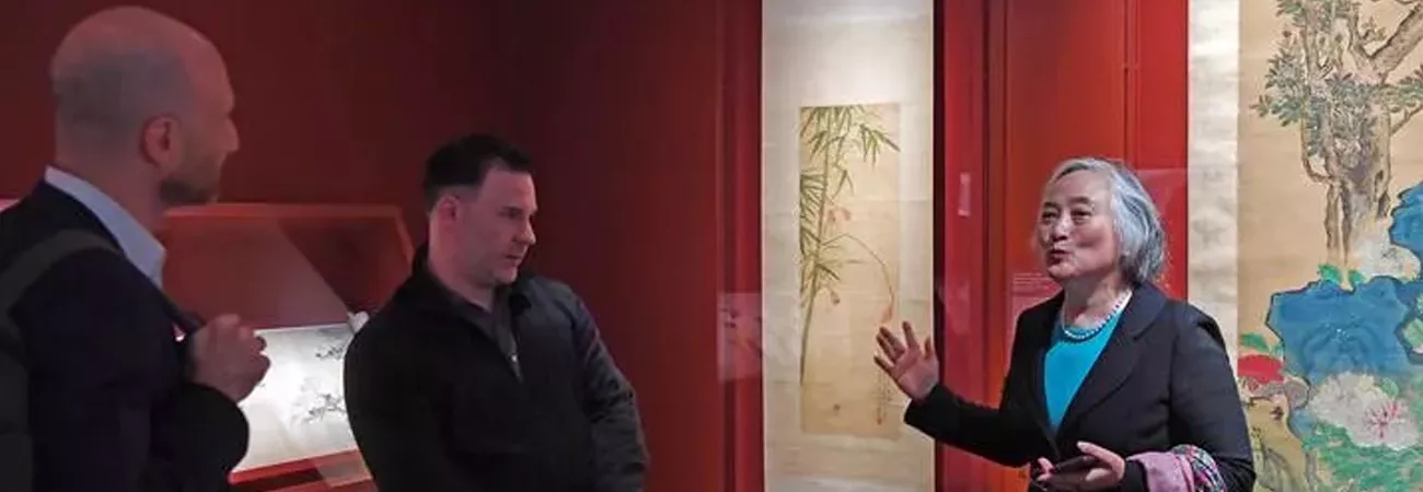 امریکی ریاست نیویارک میں چائنہ انسٹی ٹیوٹ گیلری میں منعقدہ نمائش میں گیلری کی ڈائریکٹر اور چیف کیوریٹر ولو ویلان ہائی(دائیں) فن کے شائقین کو مصوری کا ایک فن پارہ متعارف کروا رہی ہیں۔(شِنہوا)
