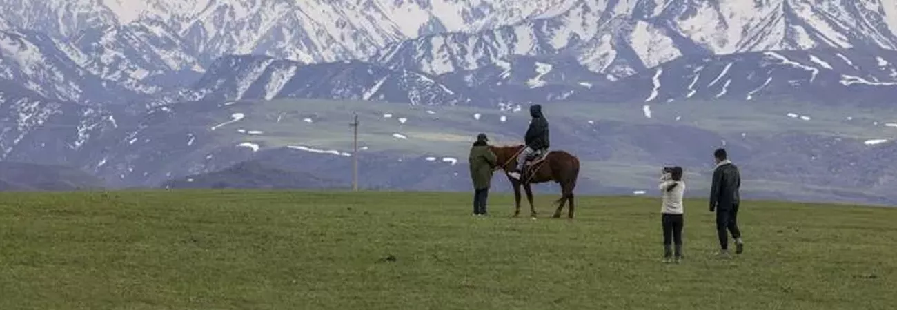 چین ، شمال مغربی سنکیانگ ویغور خوداختیار خطے کی کاؤنٹی یومن کے بارلک پہاڑی علاقے میں  سیاح ایک سبزہ زار کا دورہ کر رہے ہیں۔(شِںہوا)