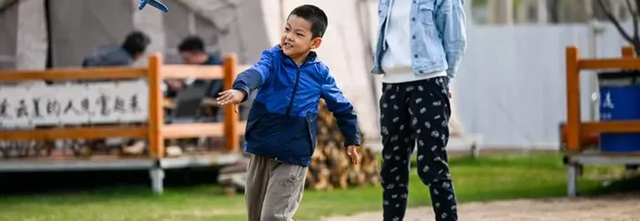 چین کے اندرون منگولیا خوداختیار خطے میں ایک بچہ کھلونا جہاز سے کھیل رہا ہے۔  (شِنہوا)