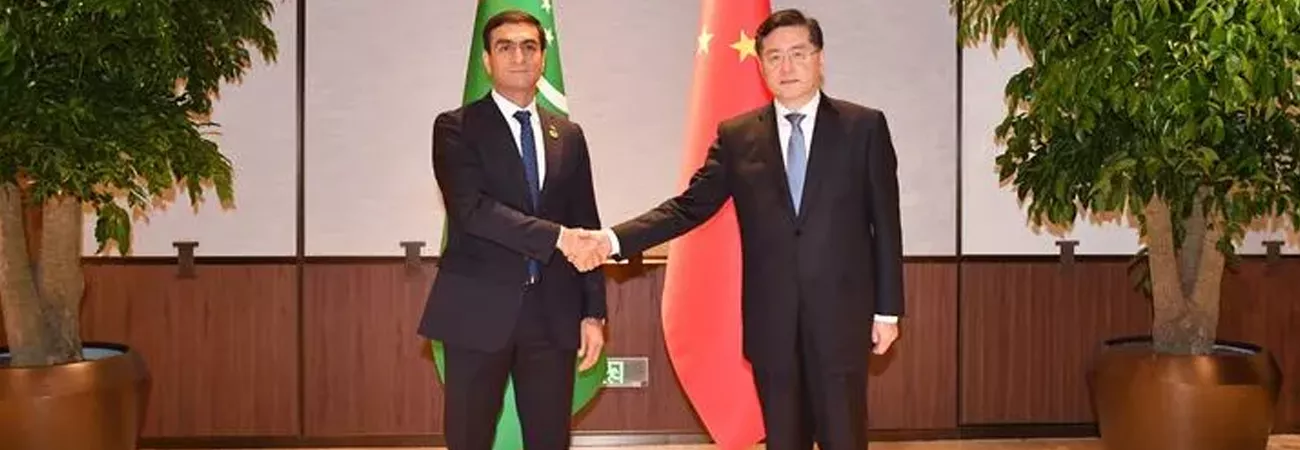 چین کے ریاستی کونسلر اور وزیر خارجہ چھن گانگ چین-وسطی ایشیا وزرائے خارجہ اجلاس میں شرکت کیلئے چین کے صوبہ شانشی کے شہر شی آن کے دورے  پر آئے ترکمانستان کے نائب وزیر خارجہ ویپا حاجییف سے بات چیت کے دوران مصافحہ کر رہے ہیں۔(شِنہوا)