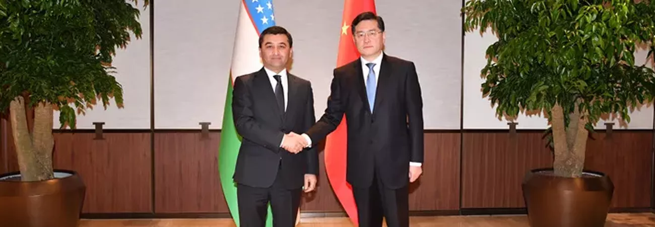 چین کے ریاستی کونسلر اور وزیر خارجہ چھن گانگ چین-وسطی ایشیا وزرائے خارجہ اجلاس میں شرکت کیلئے چین کے صوبہ شانشی کے شہر شی آن کے دورے پر آئے ازبکستان کے وزیر خارجہ بختیور سیدوف سے بات چیت کے دوران مصافحہ کر رہے ہیں۔(شِنہوا)