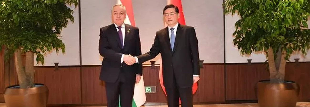 چین کے ریاستی کونسلر اور وزیر خارجہ چھن گانگ چین-وسطی ایشیا وزرائے خارجہ اجلاس میں شرکت کیلئے چین کے صوبہ شانشی کے شہرشی آن کے دورے  پر آئے تاجکستان کے وزیر خارجہ سراج الدین محردین سے بات چیت کے دوران مصافحہ کر رہے ہیں۔(شِنہوا)
