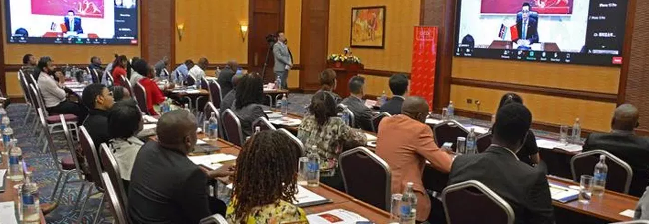 کینیا کے دارلحکومت نیروبی میں آمدہ 133 ویں چائنہ امپورٹ اینڈ ایکسپورٹ فیئر کے لیے پروموشن فورم کے انعقاد کا منظر۔(شِنہوا)