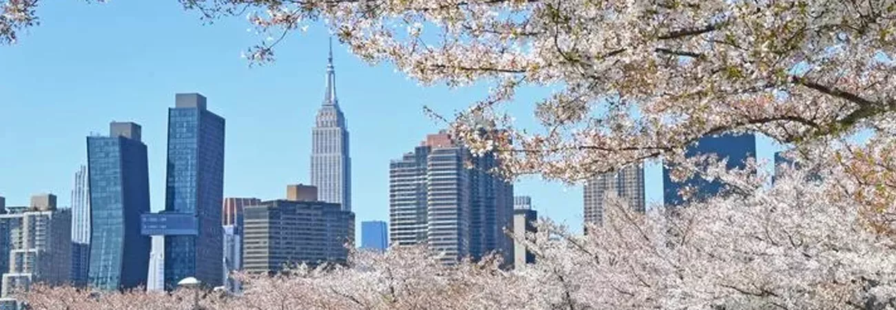 امریکی ریاست نیو یارک میں شہر کے افق پر چیری کے پھولوں کا منظر۔(شِنہوا)