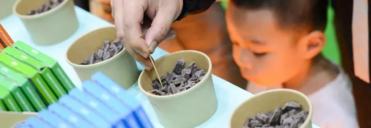 چین، جنوبی صوبہ ہائی نان کے صدر مقام ہائیکو میں منعقدہ تیسری چائنہ بین الاقوامی اشیائے صرف نمائش میں سیاح چاکلیٹ کا ذائقہ چکھ رہے ہیں۔ (شِنہوا)