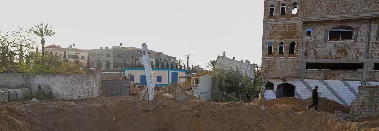 ایک فلسطینی شخص غزہ شہر میں اسرائیلی فضائی حملے میں ہونے والے نقصان کا جائزہ لے رہا ہے۔(شِنہوا)